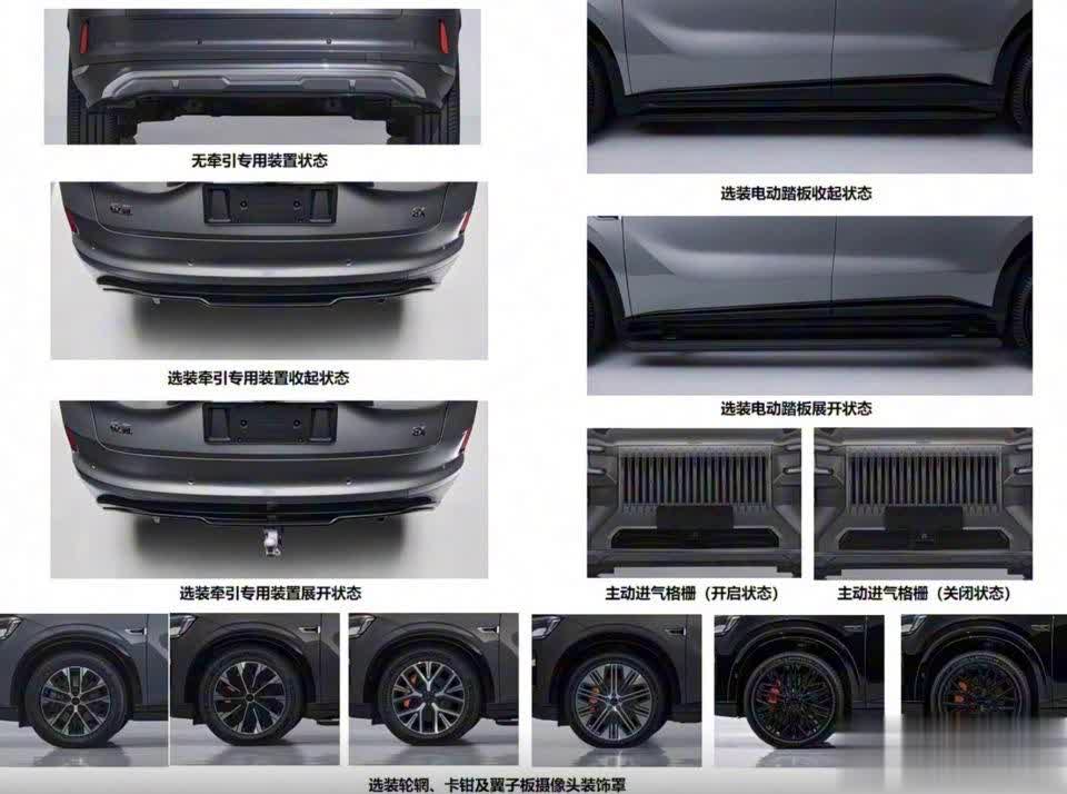 车身侧面线条流畅,溜背设计强化运动属性,配备传统机械式门把手,提供20-22英寸多规格轮辋及彩色卡钳可选,细节处可加装行李架、电动踏板等装饰件。车尾贯穿式3D悬浮尾灯点亮辨识度拉满,下方配备牵引脱钩,呼应其牵引功能,具备2000公斤的牵引资质。尺寸上,车身长宽高分别为5100/1998/1780毫米,轴距为3069毫米,提供5座与2+2+2六座布局,相比极氪9X尺寸略紧凑,兼顾空间与城市操控灵活性。